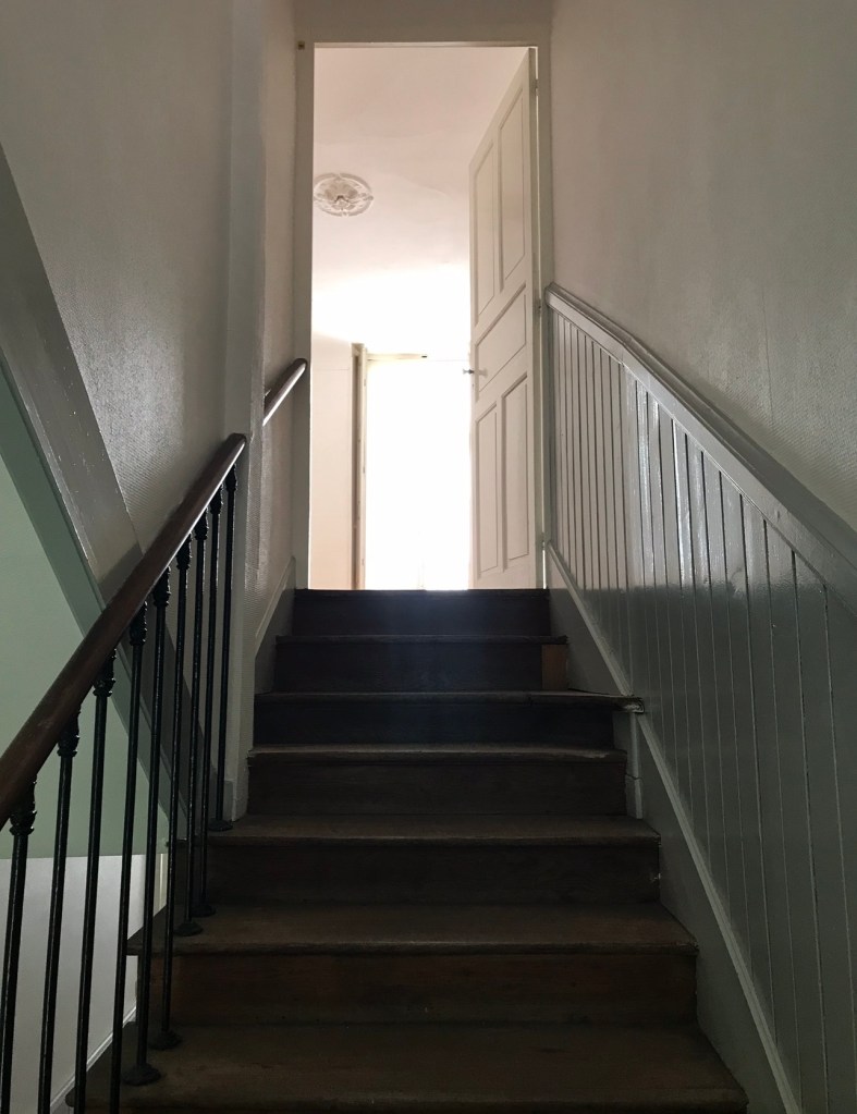 Cette photo représente la cage d’escaliers de l’immeuble. La lumière de la cage d’escaliers est située à gauche près de la porte d’entrée de l’immeuble. La poubelle avec le couvercle marron est la poubelle à ordures ménagères et la poubelle à couvercle jaune est la poubelle à recyclage ( ici seulement plastique, cannette métalliques). Les Bouteilles en verre, vides sont à laisser dans la panière blanche posée à coté de la porte d’entrée de l’appartement à coté du pot de fleurs. Montez les escaliers en bois pour accéder à la porte d’entrée de l’appartement situé au 1er étage. Passez à l’étape suivante.
