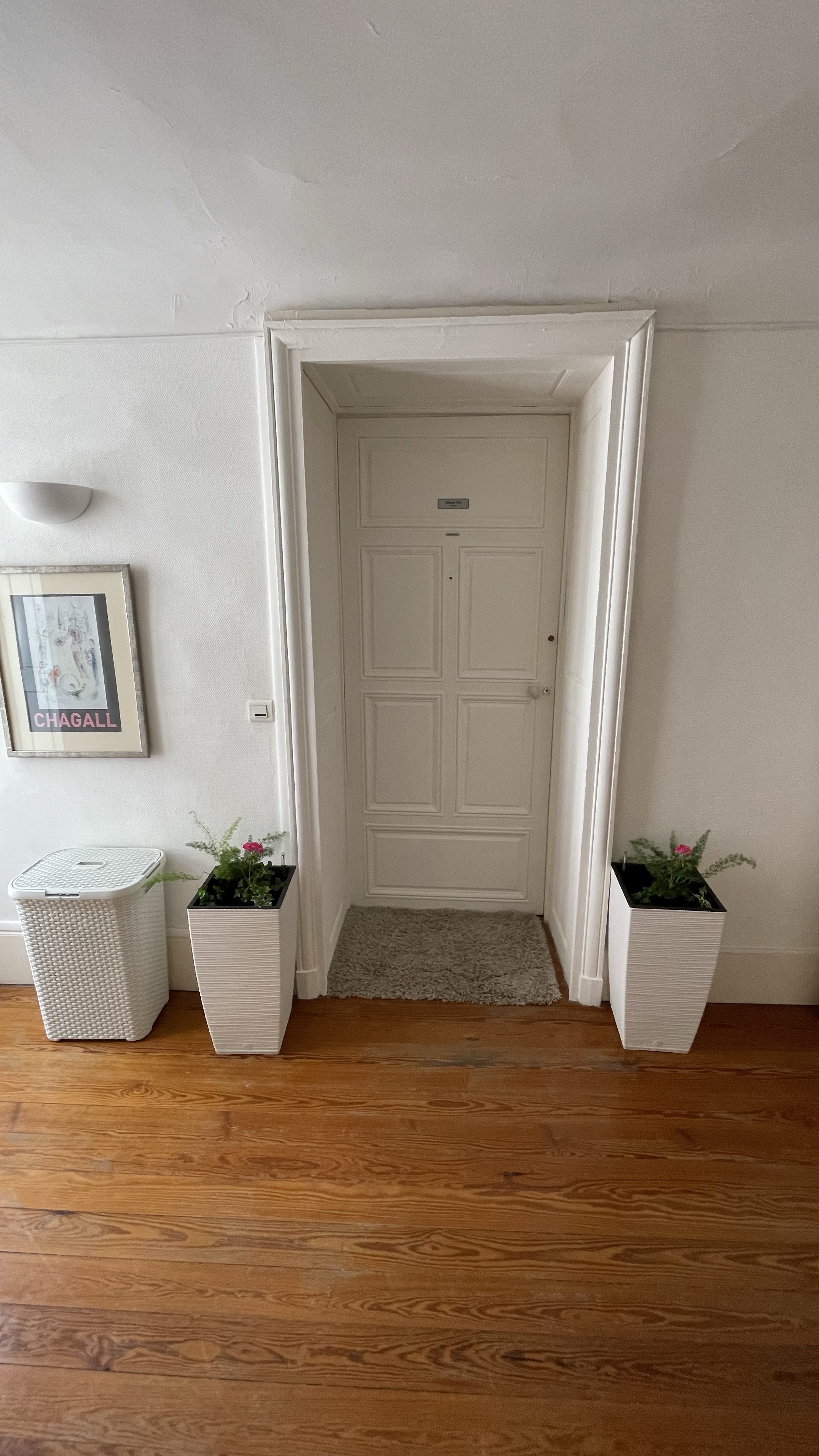 Cette photo représente la porte d’entrée de l’appartement. Le bac à linge blanc fait office de collecte des bouteilles en verre vides. Utilisez la clef dorée ou clef avec pastille rouge pour ouvrir la serrure du haut de la porte. Vous voila dans l’appartement. Envoyez moi un message SVP afin de me dire que vous êtes bien arrivées et dites moi si vous avez besoin de quelque chose. Au moment de votre départ, veiller à déposer les clefs dans la boite à clefs ( même code ) et assurez vous que la boite soit bien fermée. Le départ est fixé à 11h00 et la femme de ménage est prévue à 11h10. Envoyez nous un message lors de votre départ. Merci par avances.