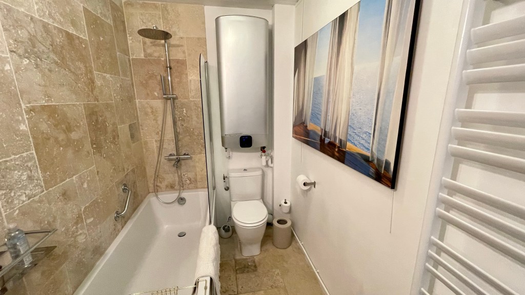 Bathroom: Bathtub with fixed & flexible shower head, sink, WC – Centifolia ( Ecological French Brand) toiletries – 3 in 1 washing gel: soap, shower gel, shampoo