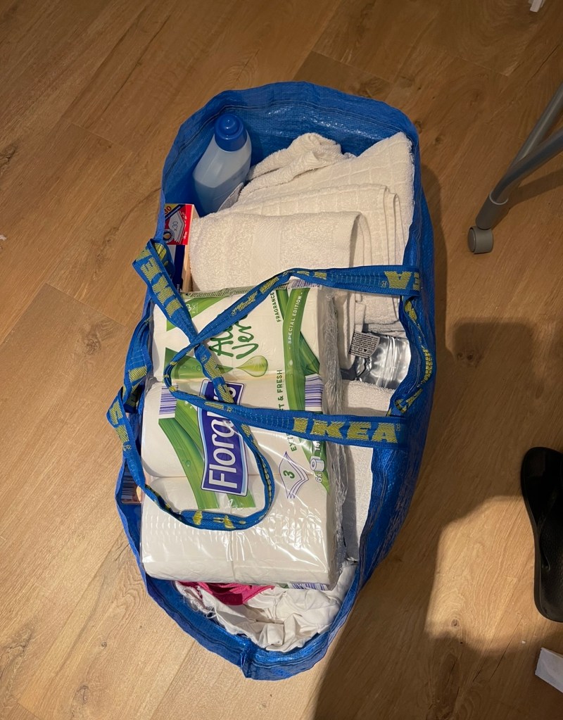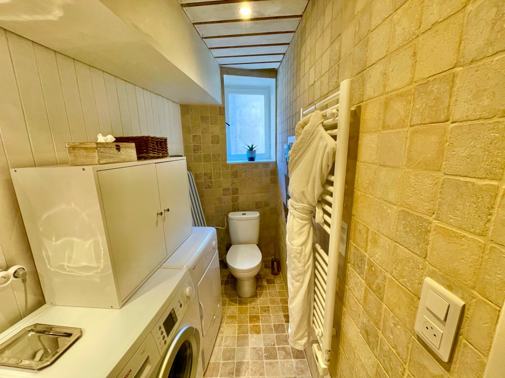 WC, lavabo, douche, bac à douche, robinets ( passez du vinaigre blanc sur les robinets et essuyez, la tete de douche flexible tournée contre le mur pour éviter les projections quand le client ouvre le robinet). Vider le tiroir du sèche linge situé dans la trappe du bas de l’appareil, nettoyer la grande glace et la petite ( 2 faces). Remplir le flacon de gel douche centifolia.