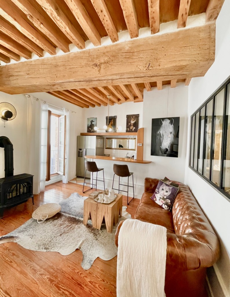 Commencez par nettoyer la cuisine ( car si vous faites la cuisine en dernier l’eau de l’évier peut salir la douche, canalisation de refoulement mal faite) : le bar, les chaises de bar, l’évier, le plan de travail, les machines ( regarder le microonde, remplir le bac de la machine Nespresso et mettre les capsules neuves dans le bol), le frigo ( intérieur, extérieur), le four ( changer si besoin le papier sulfurisé blanc par un propre), mettre les torchons de cuisine sur la poignée de la porte du four, inspecter les couverts si miettes ou traces nettoyer, nettoyer la glace et le coté du frigo, poussière piano. Nettoyer la table basse et la table du salon, mettez le couvert ( 2 assiettes, 2 couteaux, 2 fourchette, 2 serviettes de table, 1 bouteille d’eau, 2 verres). Si vous avez apporté une bouteille de vin mettez la au frigo. Passez l’aspirateur dans la cuisine et dans le salon, aspirez le tapis, les chaises, sous la table, le tapis d’entrée devant la porte. Mettez un sac poubelle propre suspendu sur les crochets du derrière le bar. Allumez le grand lampadaire situé à coté du canapé et laissez- le allumé.